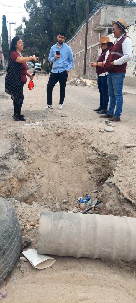 En Rústica Xalostoc, supervisaron una obra que dejó inconclusa el organismo SAPASE, en la calle Hierro, al atender un socavón abandonado por casi dos años, donde debieron cambiar 300 metros de tubería colapsada pero solo atendieron 70 metros sin compactar ni aplanar el terreno, abandonaron tubería rota y escombro, lo que sigue provocando hundimientos en el terreno y afectaciones en las viviendas de unas 60 personas.