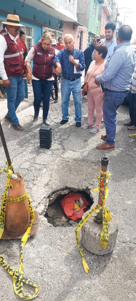 En San Agustín, vecinos de la calle Sur 40 solicitaron a la funcionaria de CAEM respaldo para reparar el socavón que se ubica a mitad de calle, por una tubería de drenaje colapsada, lo que provoca que el agua negra no tenga salida y se regrese al interior de los domicilios.