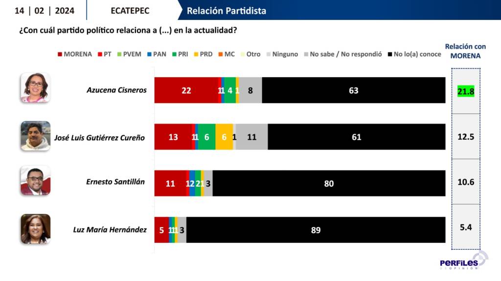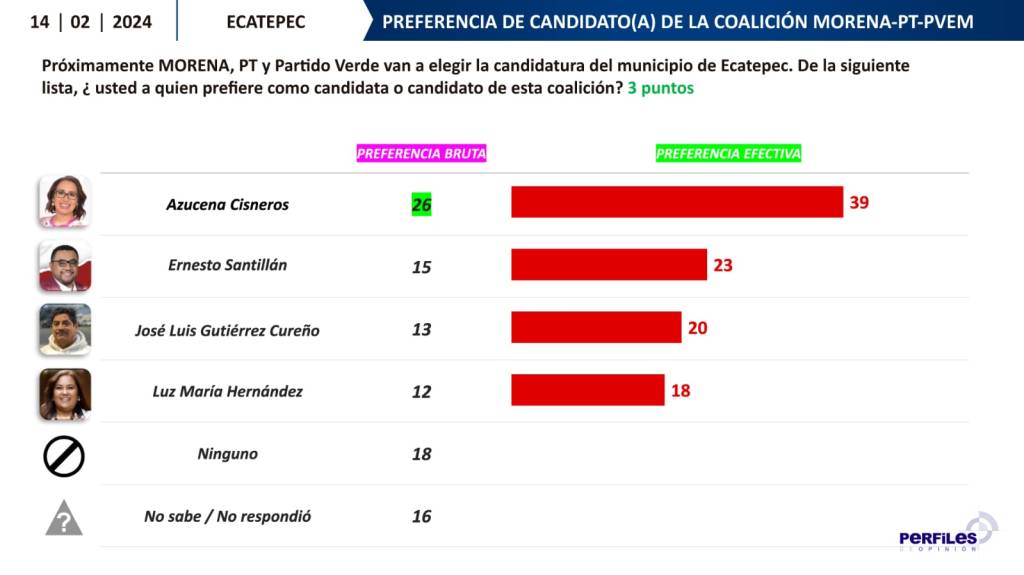 En la encuesta realizada cara a cara en viviendas de Ecatepec, a un universo de 1005 casos, del 10 al 12 de febrero de 2024, con un margen de error de +/- 3.1%, al ser cuestionados con respecto al candidato(a) de la alianza Morena PT y Partido Verde para presidente municipal de Ecatepec, se establece que la legisladora tiene una ventaja de 16 puntos con respecto a su contendiente más cercano.