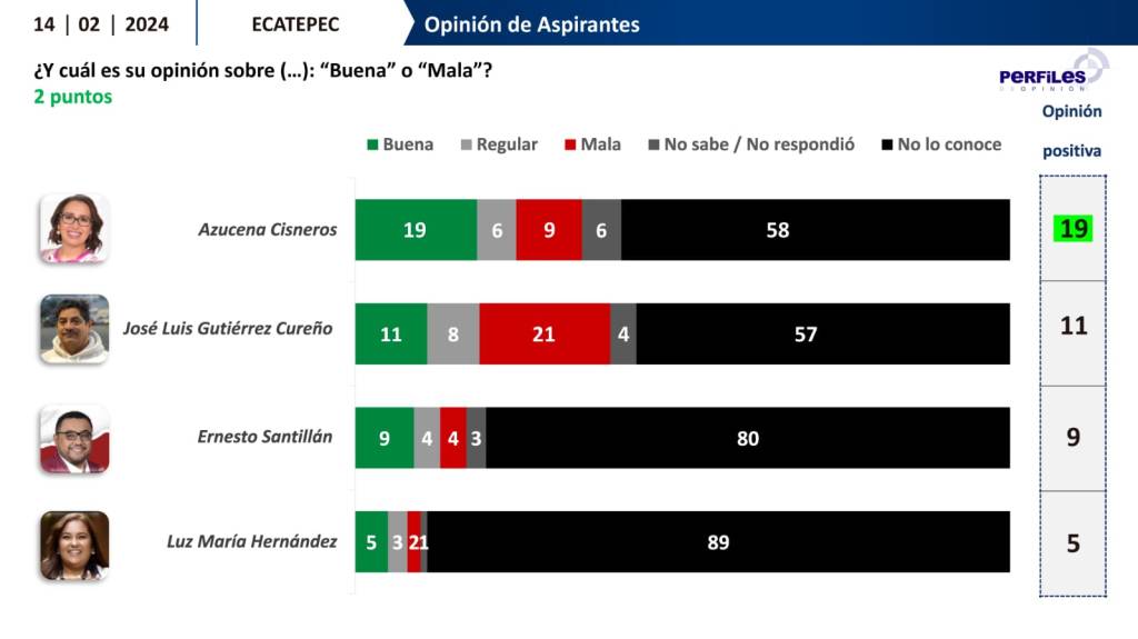 Y con respecto a la Opinión “Buena” o “Mala” de los Aspirantes, los ecatepenses le dieron a la legisladora 19 puntos de Opinión positiva.