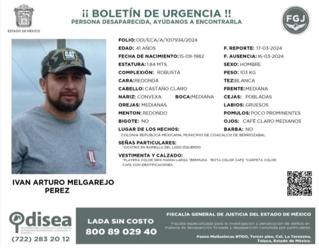 Persona desaparecida en la Sierra de Guadalupe, Coacalco, Estado de México. El día sábado 16 de marzo de 2024 Iván Arturo Melgarejo acudió a la Sierra de Guadalupe para practicar senderismo entre las 10:00 y 11:00 horas, llegó en su camioneta y la estacionó a la entrada de los senderos de la sierra, en la colonia República Mexicana. A partir de ello no se sabe su paradero, su camioneta seguía en la zona, por lo cual tenemos la impresión de que está extraviado en la misma sierra. Hasta ahora el apoyo por parte de instituciones públicas ha sido mínimo. La esposa de Iván ha solicitado a la fiscalía tener acceso a los videos de las cámaras de seguridad de la zona, pero por trámites no le han proporcionado el mismo; la intención es verificar en ellos que efectivamente Iván no descendió; esto ayudaría a enfocar todos los esfuerzos para su búsqueda en la sierra. Hoy se han reunido no más de 6 grupos de búsqueda de entre 3-5 civiles, y se cuenta con un drone pero no hay ayuda consistente y especializada por parte de instituciones públicas. Agradezco su tiempo y el apoyo que puedan proporcionarnos para difundir esta información. Contacto: Adid Lozada, hija de Iván. Teléfono 56 1140 6342.