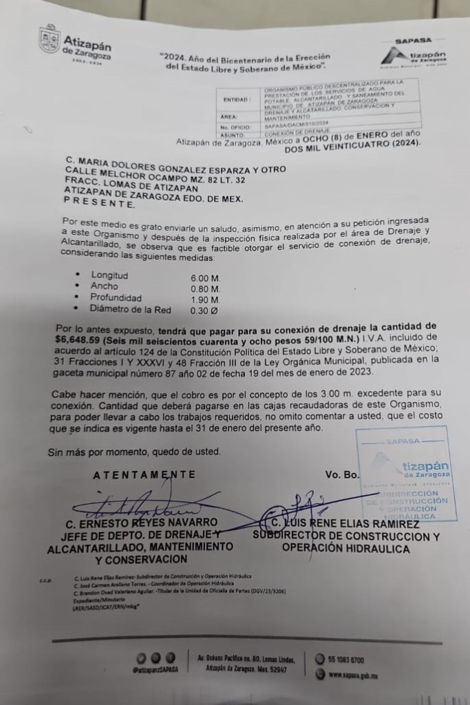 Comento que inicialmente le cobrarían por meter el drenaje a su domicilio, tendría que pagar para la conexión de drenaje la cantidad de 6648 de acuerdo al artículo 124 de la constitución política del estado libre y soberano de México.