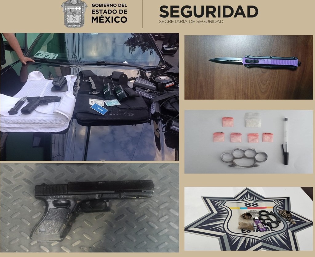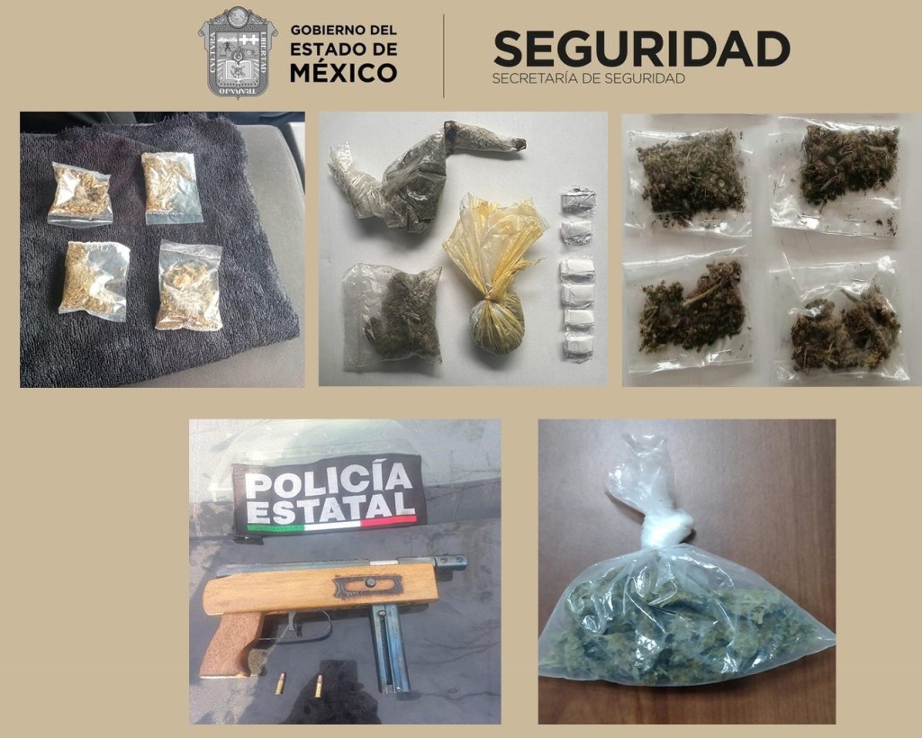 Por otra parte, se aseguró un arma de fuego artesanal, una pistola, dos réplicas de armas, cinco vehículos, diversos envoltorios de plástico con características de la marihuana, cocaína y cristal, dos navajas, un bóxer, dos chalecos antibalas, dos radios, una camisola con el escudo de la SSEM con la leyenda de policía en la espalda y cuatro vehículos del transporte público que fueron remitidos por faltas a la normatividad.