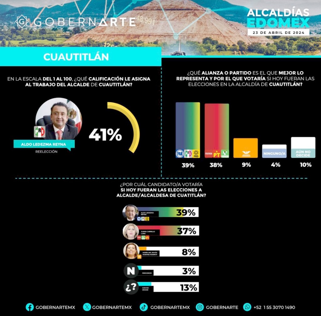 La empresa GobernArte realizó el levantamiento entre los días 09 al 17 de abril. La ciudadanía de Cuautitlán ya tiene definido por quien votar el 2 de junio.