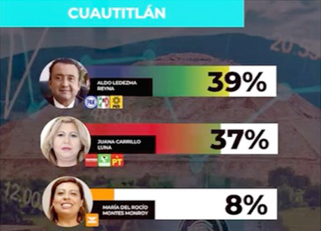 El abanderado de la coalición “Fuerza y Corazón por Cuautitlán” cuenta con el 41 por ciento, frente al 37 por ciento de la aspirante por el Movimiento de Regeneración Nacional (MORENA).