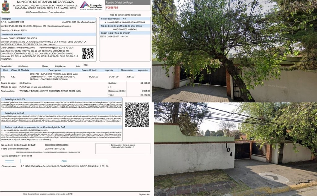 La mansión, ubicada en Avenida de la Hacienda 104, del fraccionamiento exclusivo de Club de Golf, en la Hacienda de Atizapán de Zaragoza y paga una cantidad de impuesto predial cercano a los 35,000, es de mencionar que esta propiedad tiene un largo historial, en donde también se ve incluida la candidata a diputada federal, Xóchitl Nashielly Zagal Ramírez, quien en un principio pagó la renta de la misma y después fue traicionada por Daniel Serrano y hasta la dejó embargada con los antiguos propietarios.