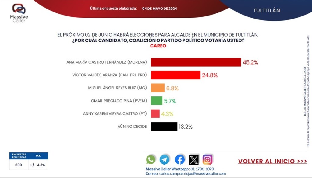 Mientras que a la pregunta de Massive Caller, “Si hoy fueran las elecciones para Presidente Municipal de Tultitlán y estos fueran los candidatos ¿por cuál alianza o candidato votaría usted? la candidata de MORENA, Ana Castro Fernández tiene el 45.2% de intención del voto; la coalición PAN-PRI-PRD con Víctor Valdés Aranza, obtiene el 24.8%; Miguel Ángel Reyes Ruiz, de Movimiento Ciudadano el 6.8%; Omar Preciado Piña, por el PVEM 5.7%; y por el PT, Anny Kareni Vieyra Castro, el 4.3%, Así terminaría la votación del 2 de junio.