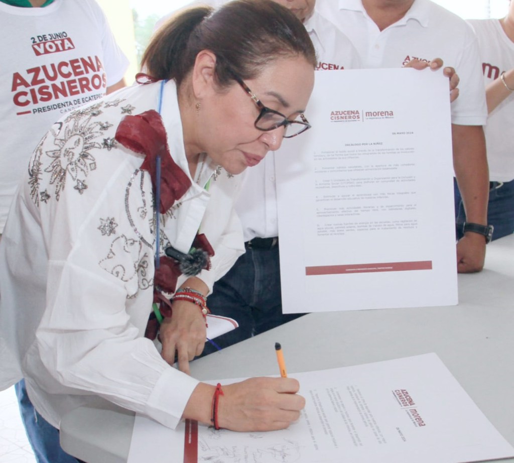 Ecatepec, Méx.- Tras firmar el Decálogo por la Niñez, en la plaza cívica del Pueblo de Santa Clara Coatitla, la candidata de MORENA a la Presidencia Municipal, Azucena Cisneros Coss afirmó que a las niñas y niños hay que fortalecerlos para su desarrollo personal y emocional, porque de ello depende cómo será su adolescencia y adultez.