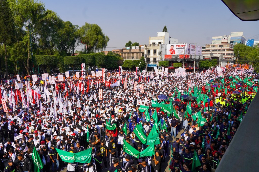 Más de 20 mil trabajadores de distintos sindicatos se reúnen en Tlalnepantla para conmemora 138 años de la lucha por los derechos laborales.
