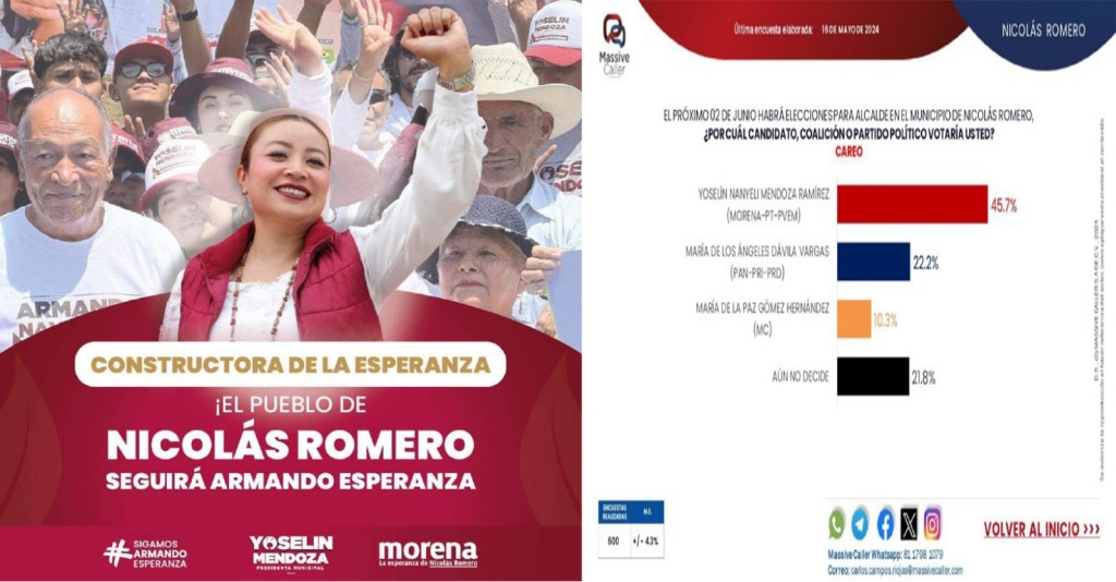 Lo anterior, fue confirmado por la encuesta levantada el pasado 16 de mayo por la consultora Massive Caller, que la ubica con el 45.7 por ciento de las preferencias entre la ciudadanía nicolasromerense.