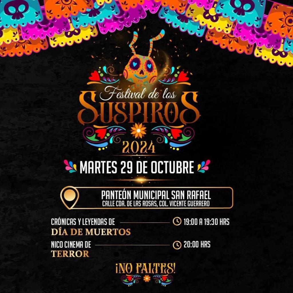 Este año el gobierno municipal de Nicolás Romero ofrece la cartelera sobre el Festival de los Suspiros, iniciando el próximo martes 29 de octubre, en las instalaciones del panteón municipal de San Rafael, donde los asistentes podrán conocer crónicas y leyendas alusivas al Día de Muertos, actividad que se llevará a cabo en un horario de 7:00 a 7:30 pm; ese mismo día, se proyectará el “Cinema de Terror”, a partir de las 8:00 pm.