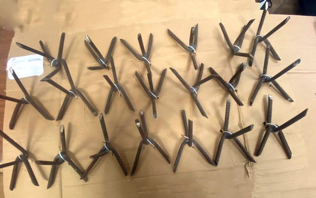 Tras llevar a cabo la inspección, en la cajuela del automóvil localizaron 20 poncha llantas de fabricación artesanal de varilla, al cuestionarlo sobre los objetos, este refirió que se los dieron para ponerlos en la carretera, también decomisaron un radio portátil de comunicación, de la marca Motorola.