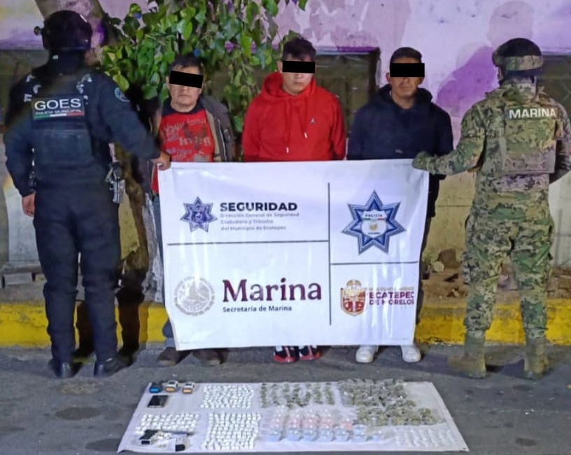 Fuerte golpe a “narcomenudistas” propinan policías municipales de Ecatepec y efectivos de la Marina. Atoran a 3 mininarcos con mota, coca, cristal (piedra) y metanfetamina en cápsulas, además de una pistola y radios de comunicación.