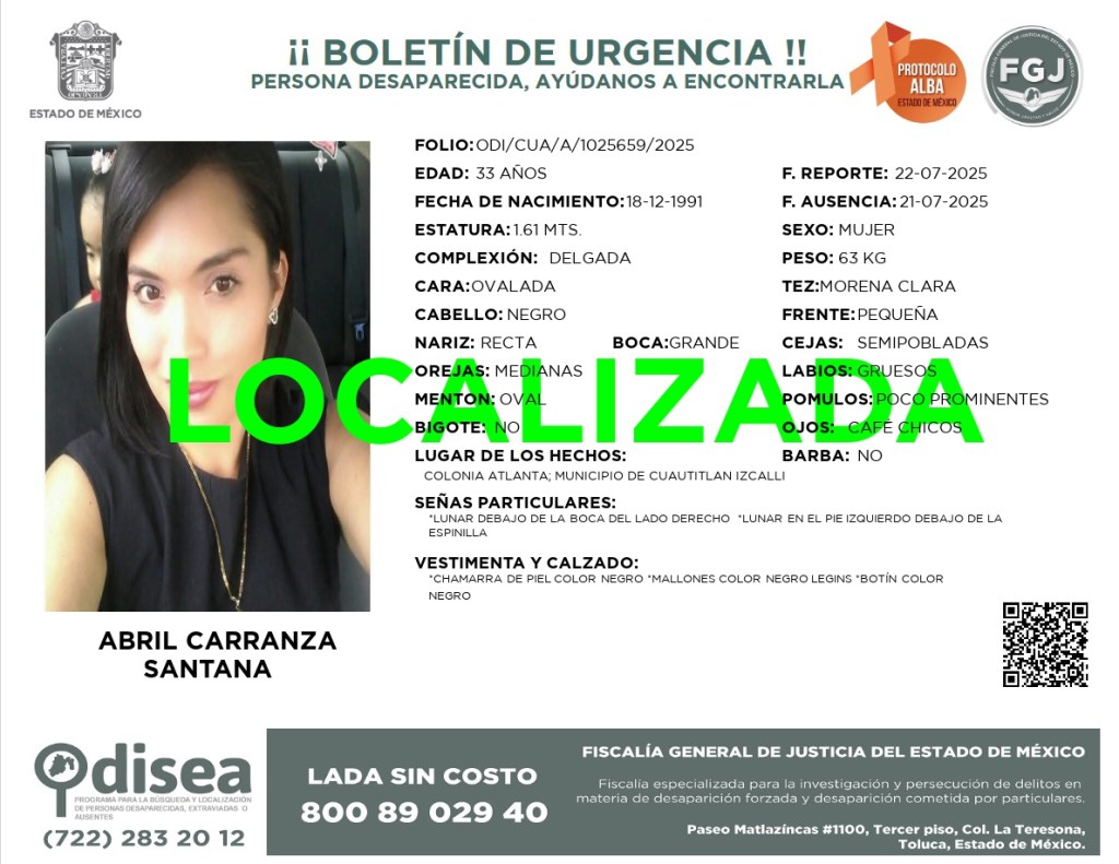 Cuautitlán Izcalli, Méx.- La Policía de Género y la Célula de Búsqueda de Personas de Cuautitlán Izcalli, en coordinación con la Fiscalía de Personas Desaparecidas del Estado de México, logró la reintegración al núcleo familiar de Abril Carranza Santana, persona reportada como desaparecida y con ficha de búsqueda emitida el lunes pasado.