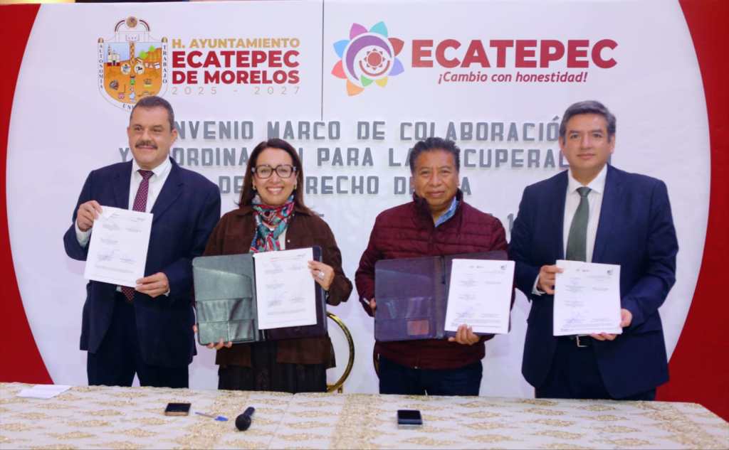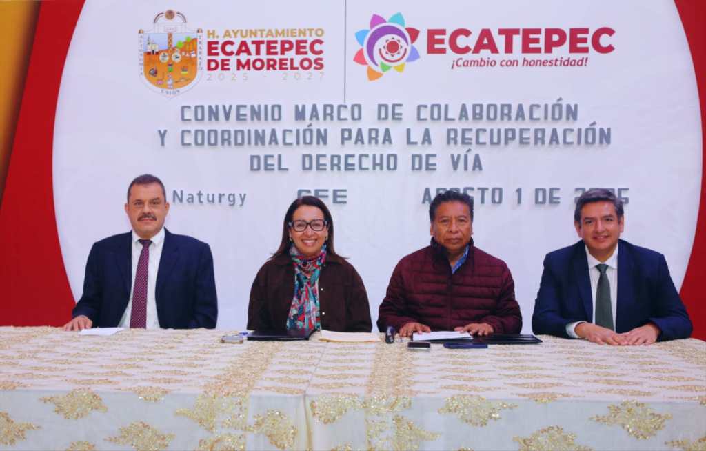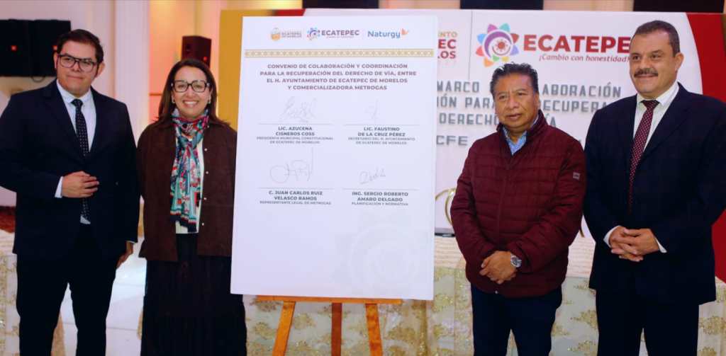 Lo anterior durante la firma del Convenio de Colaboración y Coordinación para la Recuperación del Derecho de Vía, entre el H. Ayuntamiento de Ecatepec de Morelos, CFE y la comercializadora Metrogas, signado por Cisneros Coss, Ismael Flores Aguilar, representante del gerente regional de transmisión Valle de México de la CFE, Cecilio Luis Jiménez, y Juan Carlos Ruiz Velasco, representante legal de Metrogas.