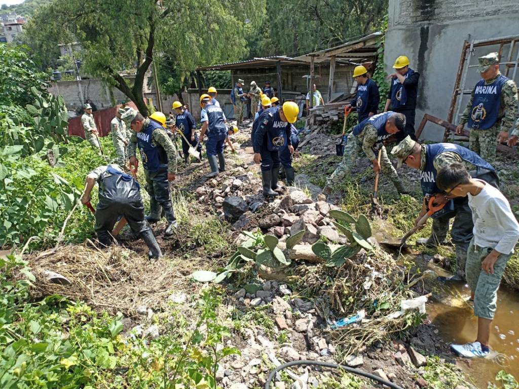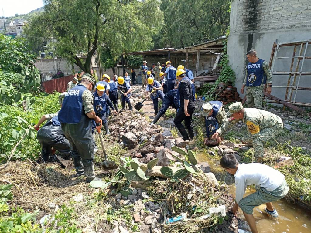 Ecatepec, Méx.- Personal naval Fuerza de Tarea Ecatepec aplicó el Plan Marina en su Fase IV de Recuperación, en coordinación con elementos de la policía municipal y trabajadores de Servicios Públicos, con brigadas para limpieza de la barranca de San Andrés de la Cañada, así como retiro de lodo y piedras en calles derivado de la bajada de aguas broncas por la intensa lluvia de la madrugada de este martes.