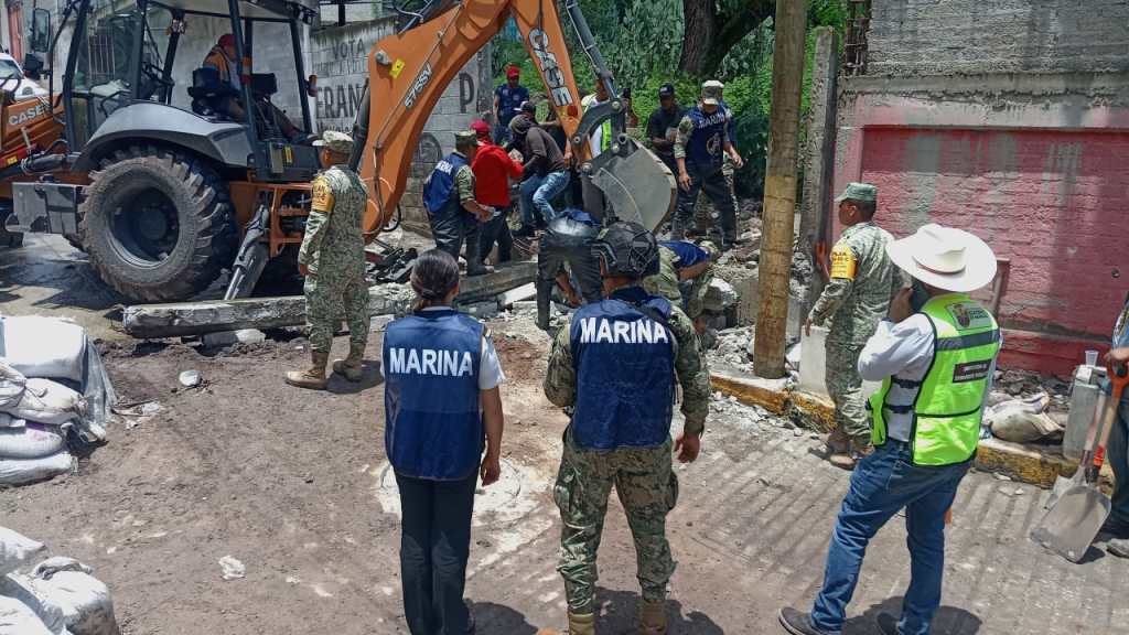 Marinos y policías, así como personal de Sedena y Servicios Públicos, realizaron limpieza en puntos de difícil acceso, retiro de escombros de las calles, apoyo en el aseo de hogares y seguridad perimetral a personal de Protección Civil durante la evaluación de daños, bajo la supervisión del comisario de Seguridad Ciudadana y Tránsito Municipal, Edgar Machado Peña.