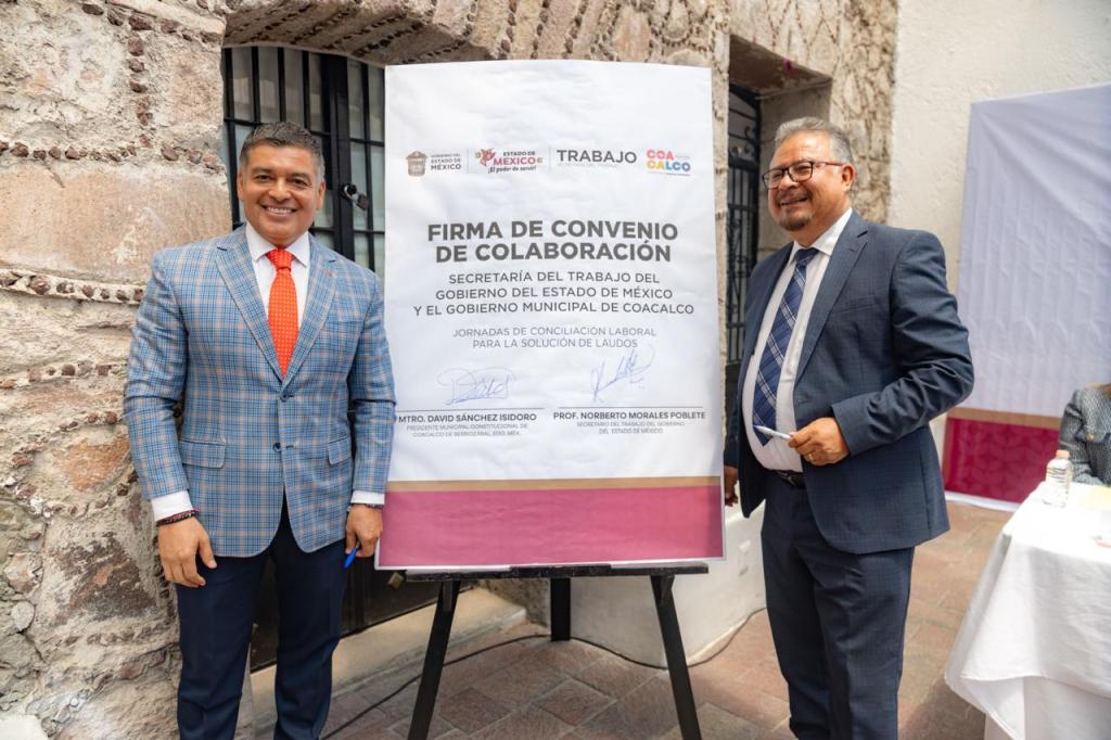 Coacalco, Méx.- El presidente municipal de Coacalco, David Sánchez Isidoro, se reunió con el secretario del Trabajo del Estado de México, Norberto Morales Poblete, para la firma de un convenio de colaboración que tiene como propósito coordinar y llevar a cabo jornadas de conciliación laboral para la solución de laudos.