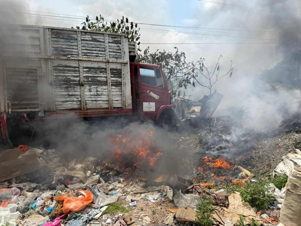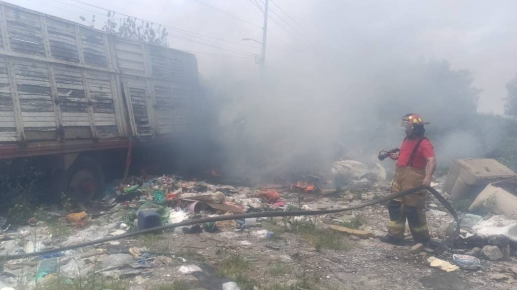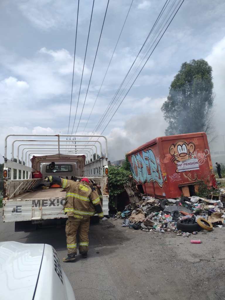 El siniestro se registró en un terreno baldío ubicado en calle Ejido 10, a un costado del Circuito Exterior Mexiquense, donde se incendiaron toneladas de desechos domésticos en un área de 100 metros cuadrados y un camión chatarra tipo Torton con basura.