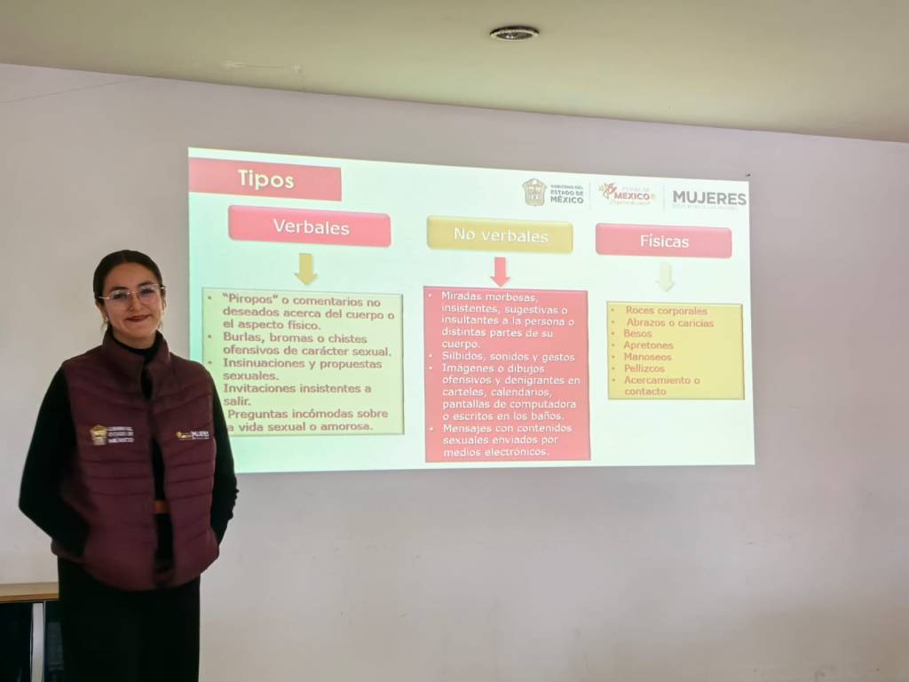La presentación estuvo a cargo de la Lic. Karen Mejía, integrante de la Dirección General de Transversalización de la Perspectiva de Género de la dependencia estatal. Entre los temas abordados destacan las estadísticas de violencia en contra de las mujeres a nivel nacional y en la entidad; los efectos psicológicos, físicos y sociales de estas conductas, así como la importancia de denunciarlas.