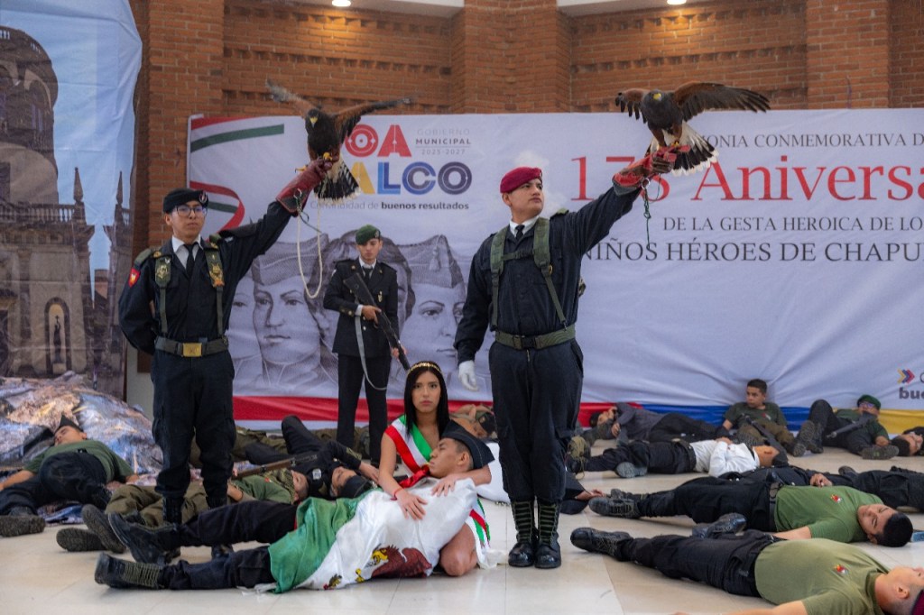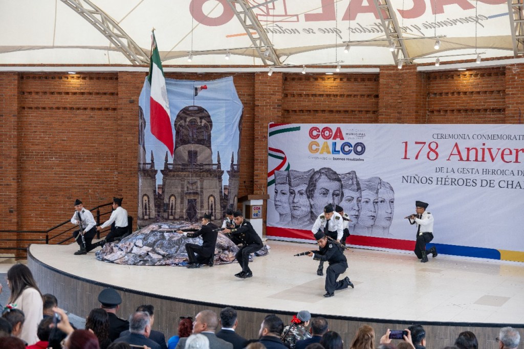 Coacalco, Méx.- El presidente municipal, David Sánchez Isidoro, encabezó la conmemoración del 178 aniversario de la Gesta Heroica de los Niños Héroes de Chapultepec en el Centro Cultural “Ing. Juan Manuel Pérez Balbuena”, donde invitó a seguir el ejemplo de los cadetes y luchar por un México justo y libre, un México que enorgullezca a todos los que habitamos en él.