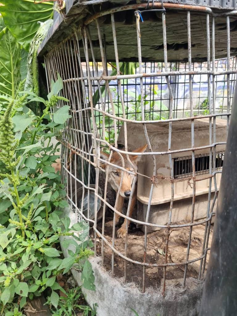 Al hacer la inspección ocular se verificó la existencia de un coyote (canis latrans) retenido dentro de una jaula muy reducida. Al tratarse de una especie silvestre no doméstica, se procedió a levantar la denuncia ante la PROFEPA, mediante el sistema electrónico con el folio 0919017, abierto el mismo lunes 8 de septiembre.