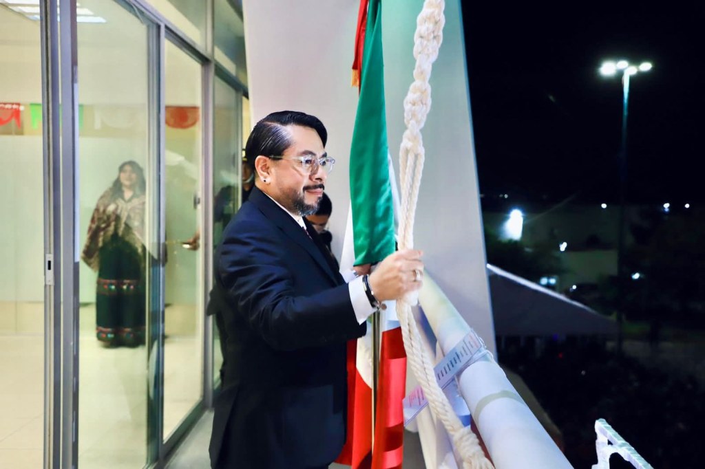 Acompañado de la Secretaria del Ayuntamiento, Ivonne Blanco, el Presidente Municipal encabezó los honores a la Bandera, para posteriormente salir al balcón principal y desde ahí nombrar a cada uno de las heroínas y héroes de la Independencia.