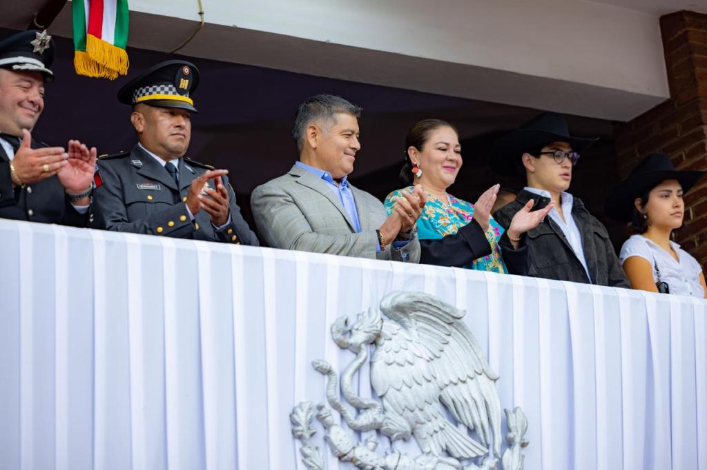 Acompañado por la presidenta honoraria del DIF Municipal, María de Lourdes González Ocampo, sus hijos, integrantes del cuerpo edilicio y directores, el alcalde de Coacalco presenció el desfile y saludó a los contingentes desde el balcón del Palacio Municipal.