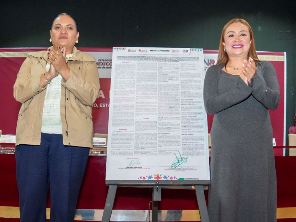 Nicolás Romero, Méx.- Como parte de las políticas públicas para proteger, cuidar y preservar el desarrollo sostenible, la Presidenta Municipal, Yoselin Mendoza, firmó, junto a la Secretaria de Medio Ambiente y Desarrollo Sostenible del Estado de México, Alhely Rubio Arronis, convenios que contribuirán a proteger el medio ambiente en territorio nicolasromerense.