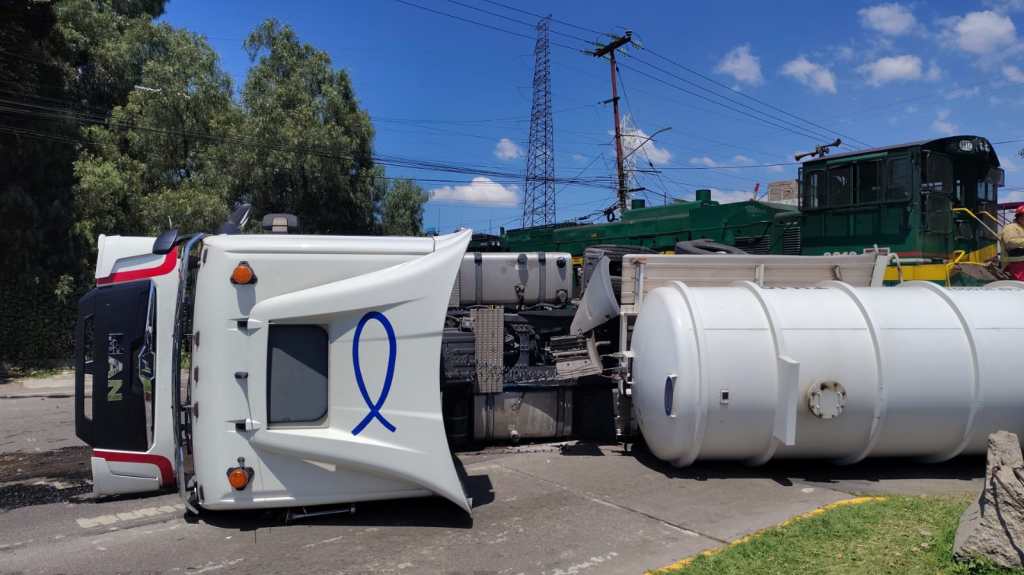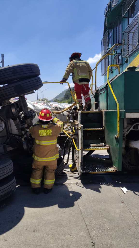 Ecatepec, Méx.- Elementos de Protección Civil y Bomberos atienden la volcadura de una pipa de hipoclorito de sodio vacía, que quiso ganarle el paso al tren en la Vía Morelos, en la colonia La Purísima Tulpetlac, sin que representen riesgo a los transeúntes y automovilistas.
