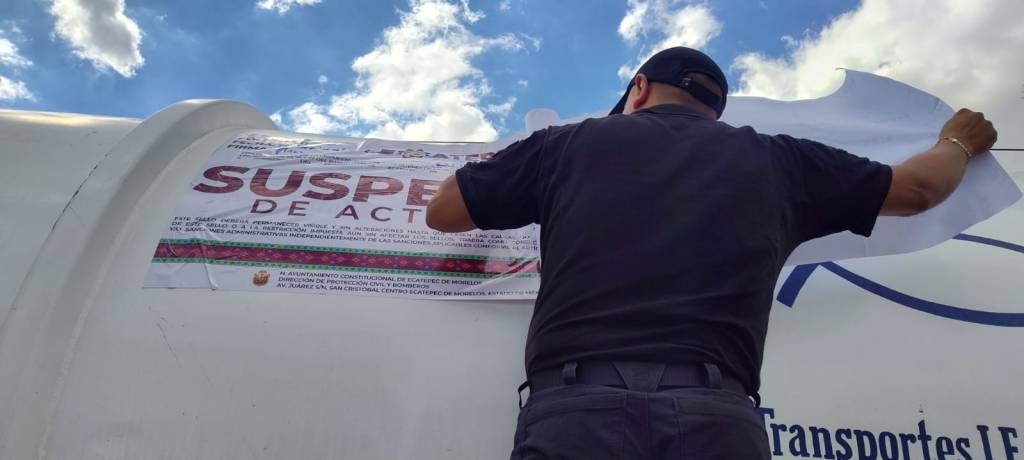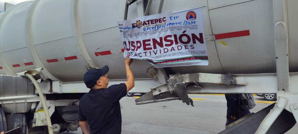 Luego de varias maniobras con apoyo de una grúa, el tractocamión fue puesto en pie y estacionado en la avenida, además de que personal de Protección Civil colocó sellos de suspensión a la pipa.
