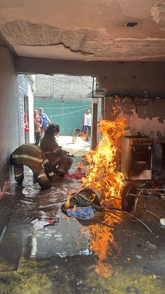 En el lugar, personal de Bomberos halló dos cilindros de gas en llamas, uno de 20 kilos y uno de 10 kilos, los cuales fueron apagados, los cuales se encontraban en un cuarto de 6 por 4 metros cuadrados aproximadamente, que usan como cocina, y que dejó daños en estufa, mesa y artículos de cocina.