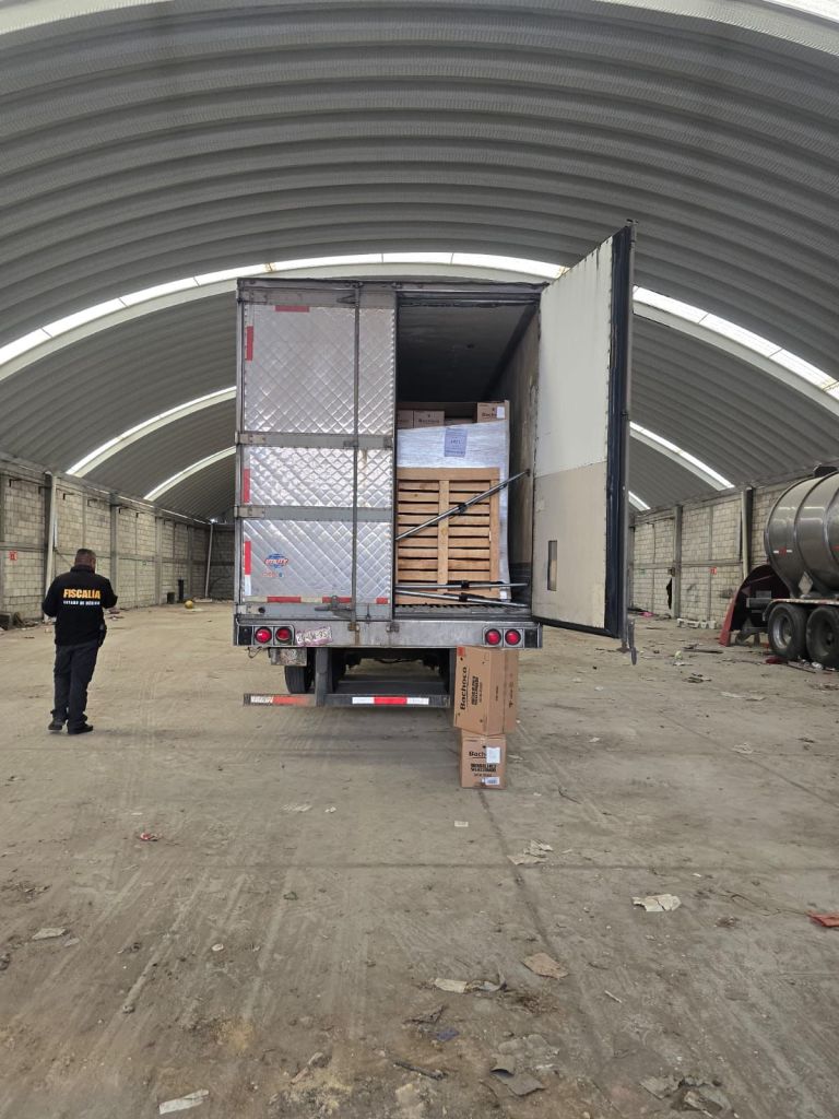 Una vez autorizado el mandamiento judicial, elementos de la Fiscalía y de la Secretaría de Seguridad estatal, se constituyeron en dicho domicilio, en donde fueron localizados la caja y la mercancía, así como un vehículo diverso, tipo autotanque, galvanizado el cual cuenta con reporte de robo, de fecha 26 de septiembre de 2025.