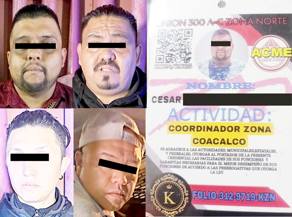 Los policías municipales detuvieron en el sitio a Javier Alejandro “N” (conductor de la camioneta), Alejandro Eliel “N”, Israel “N” y César Antonio “N”, este último que portaba un gafete con logotipos de la Unión 300 AC Zona Norte y ACME, que lo acredita como coordinador de la Zona Coacalco.