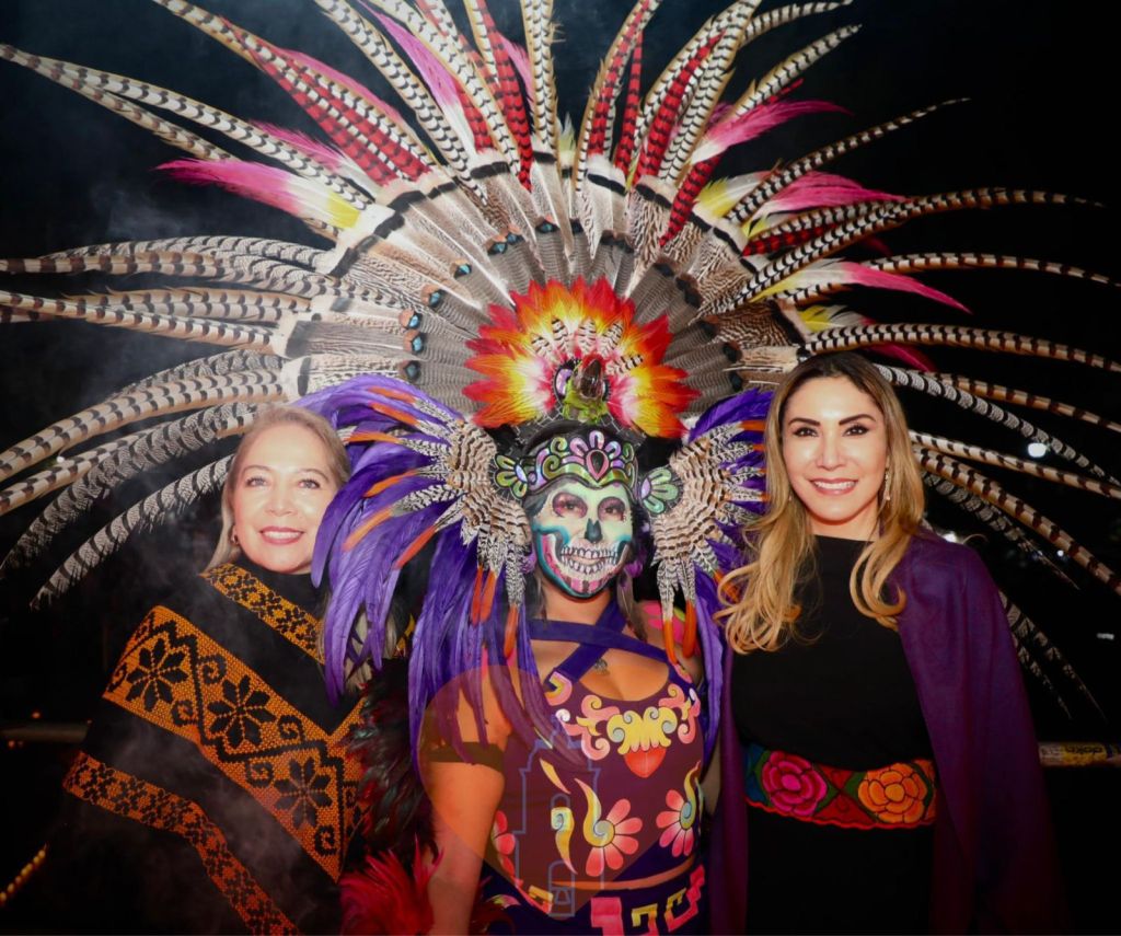 Tepotzotlán, Méx.- Acompañada de la Subsecretaria de Turismo del Estado Fátima Olivares, la Presidenta Municipal María de los Ángeles Zuppa Villegas encabezó la inauguración de la Festividad de Día de Muertos en Tepotzotlán, que contempla un tapete monumental en la Plaza de la Cruz, ofrendas tradicionales en el Atrio de los Olivos y la primera Mega Ofrenda Digital en la Plaza Cívica.