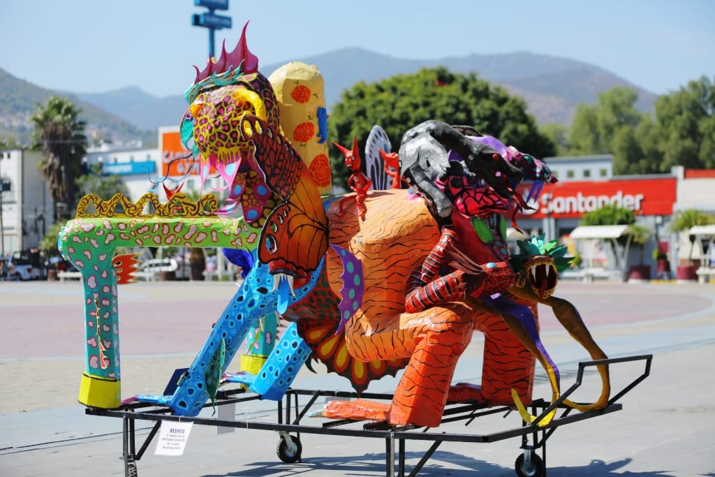El alebrije es una mezcla de diversos animales, como mantis, murciélago, búho y un diablo, además de varios elementos prehispánicos, montados en estructura de alambre y papel, que requirió dos meses de trabajos del Colectivo “Cuervos Cartoneros”, conformado por 10 personas, creado hace 17 años, la mayoría de ellos originarios de la colonia La Popular.