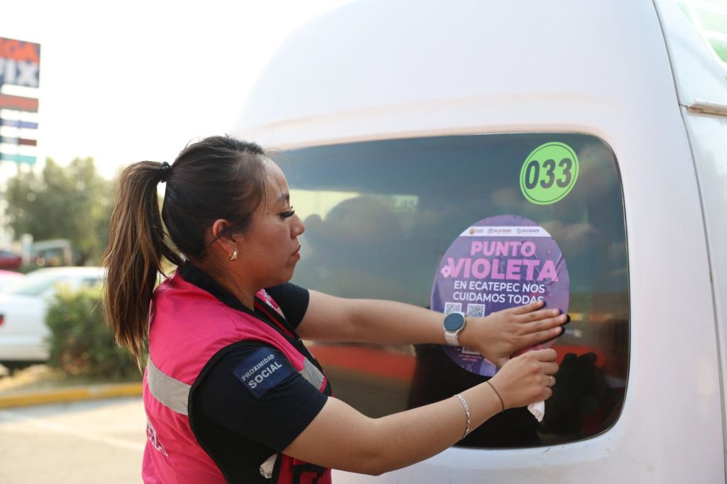 En Avenida Nacional, en Santo Tomás Chiconautla y Ciudad Cuauhtémoc, elementos de Prevención del Delito y Policía de Género colocaron calcomanías de Puntos Violeta en combis y camiones de transporte público, para crear redes de seguridad con transportistas y pasajeros que al detectar situaciones de riesgo puedan realizanlas a Centro de Mando de la policía municipal para pedir su intervención.