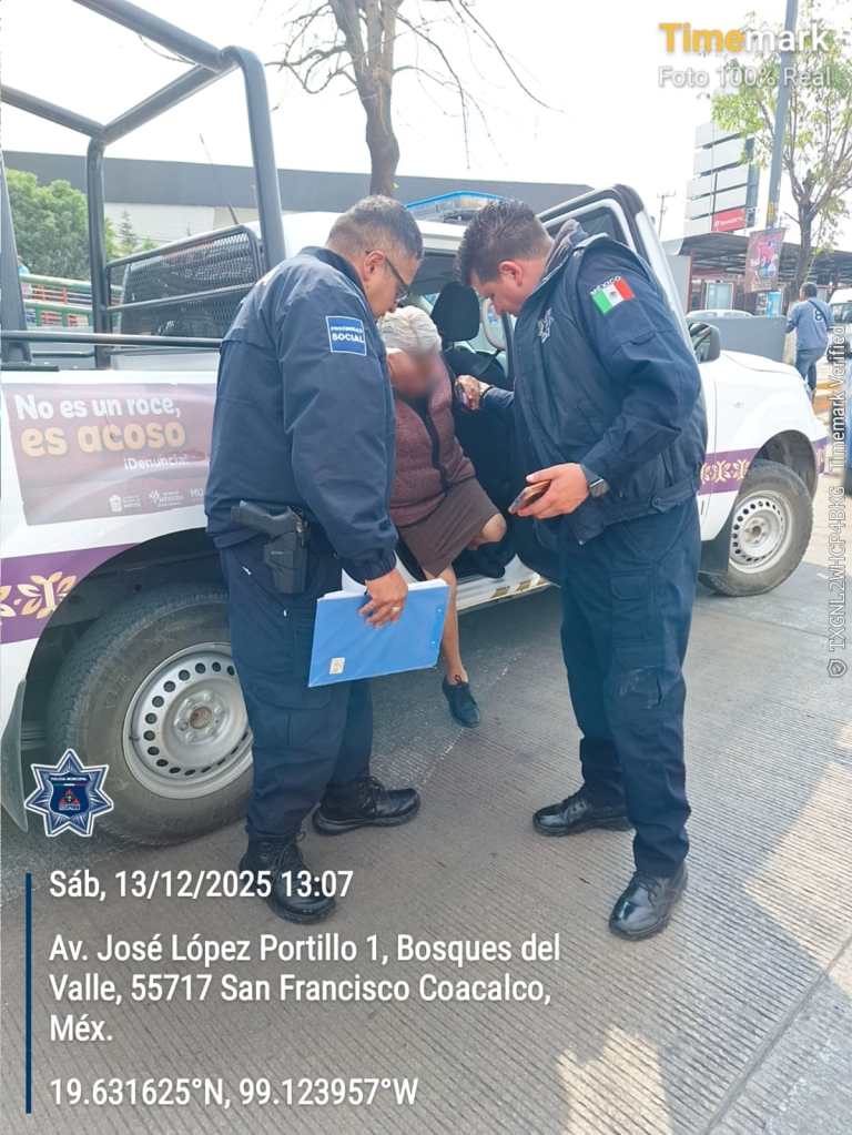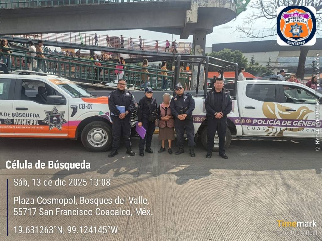 Elementos de la Unidad de Género ubicaron a la adulta mayor que se encontraba desorientada por lo que, de manera inmediata llamaron a la unidad de la Célula de Búsqueda. La mujer de 80 años se encontraba en el municipio de Coacalco de Berriozábal, dijo ser de Cuautitlán Izcalli por lo que se inició de manera inmediata acciones de búsqueda y localización de sus familiares, procediendo a encontrar a su hijo con residencia en el municipio de Ecatepec de Morelos.