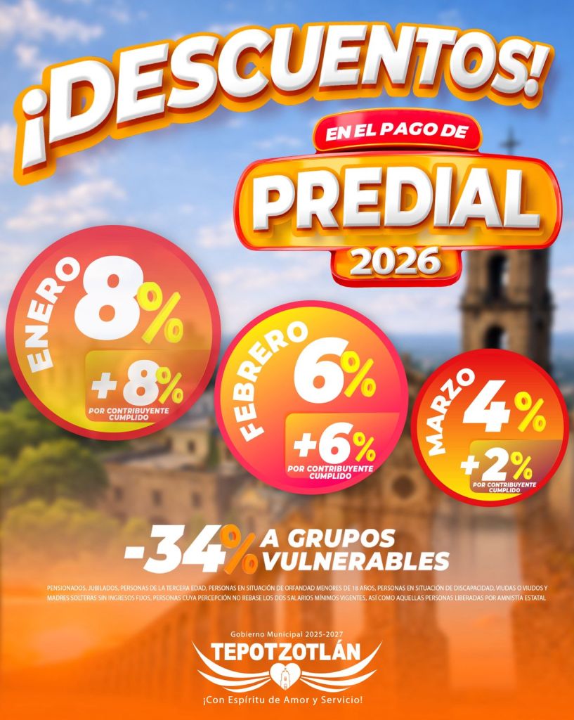 Tepotzotlán, Méx.- Con el objetivo de apoyar la economía de las familias tepotzotlenses y fomentar una cultura de cumplimiento responsable, el Ayuntamiento de Tepotzotlán 2025–2027, encabezado por la Presidenta Municipal María de los Ángeles Zuppa Villegas, aprobó un atractivo esquema de descuentos por pago anticipado del impuesto predial y el servicio de agua potable para el ejercicio fiscal 2026.