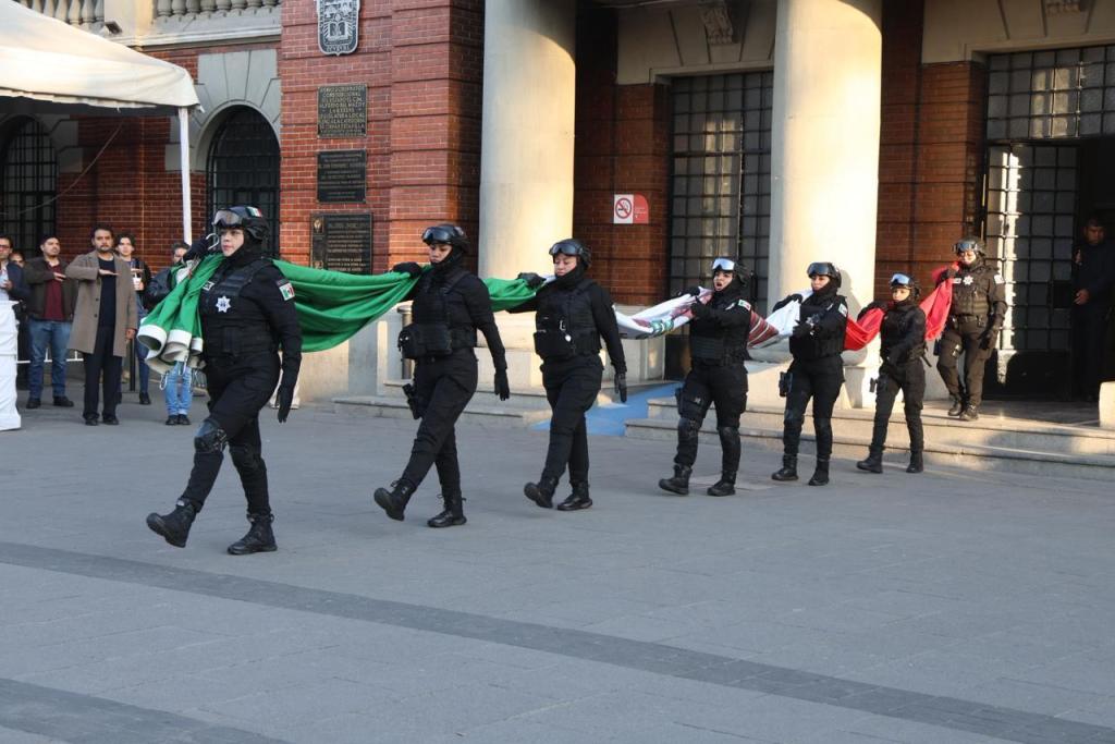 Los elementos de la Comisaría General de Proximidad realizaron el despliegue y la custodia de la Bandera Nacional, mientras que la banda de guerra ejecutó los toques reglamentarios.