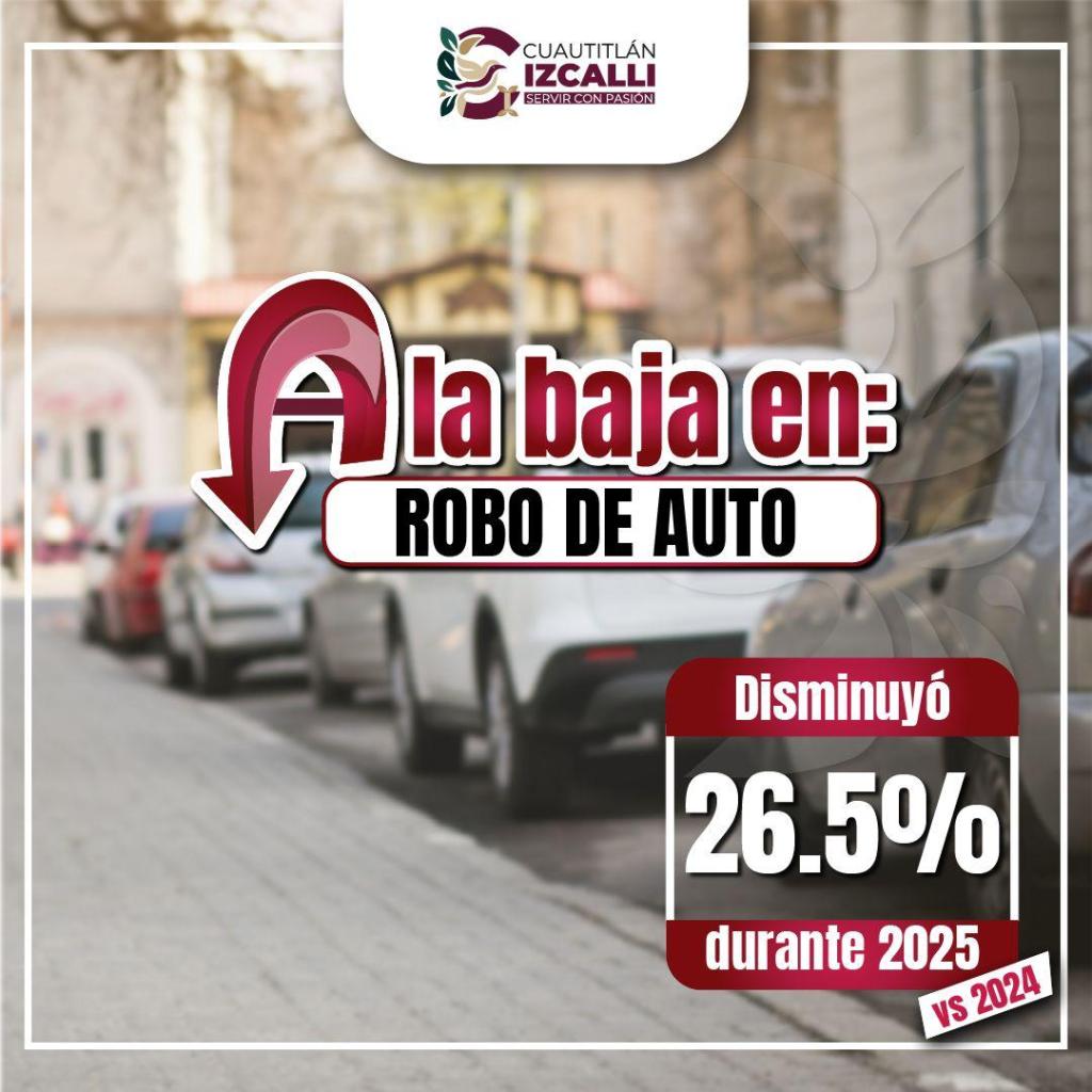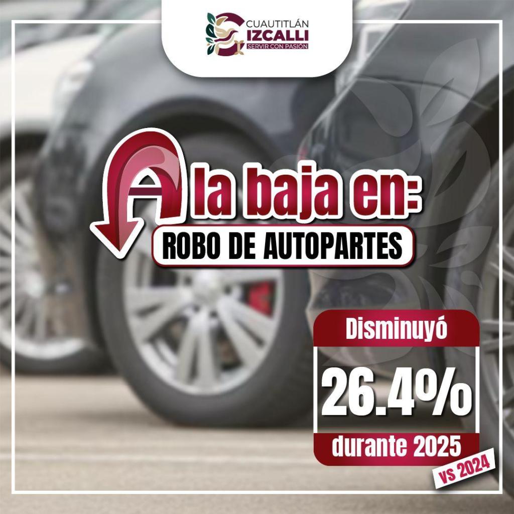 Cuautitlán Izcalli, Méx.- El Secretariado Ejecutivo del Sistema Nacional de Seguridad Pública (SESNSP) señala en su análisis anual que el delito de robo de auto bajó 26.5 % y el delito de robo de autopartes disminuyó 26.4 % durante el año 2025, comparado con el 2024.