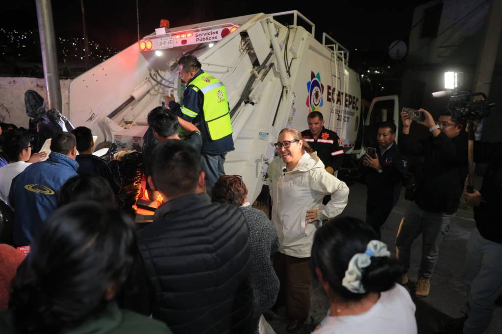Ecatepec, Méx.- La alcaldesa Azucena Cisneros Coss supervisó la recolección nocturna de basura en la Sierra de Guadalupe, servicio completamente gratuito y permanente que opera los días lunes, miércoles y viernes de 22:00 a 01:00 horas en zonas altas del municipio.