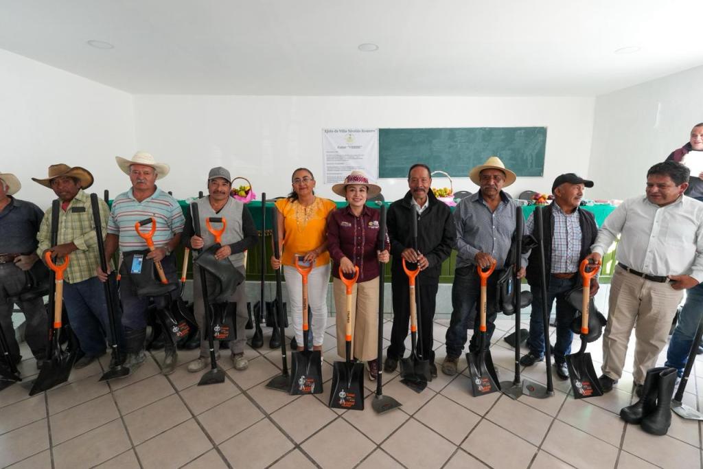 En su visita al Ejido Nicolás Romero, entregó palas, azadones y botas en las oficinas ejidales, equipos que contribuyen a un mejor desarrollo de las actividades del campo, refrendando su compromiso con el agro, al que reconoció como fundamental para la vida del municipio.