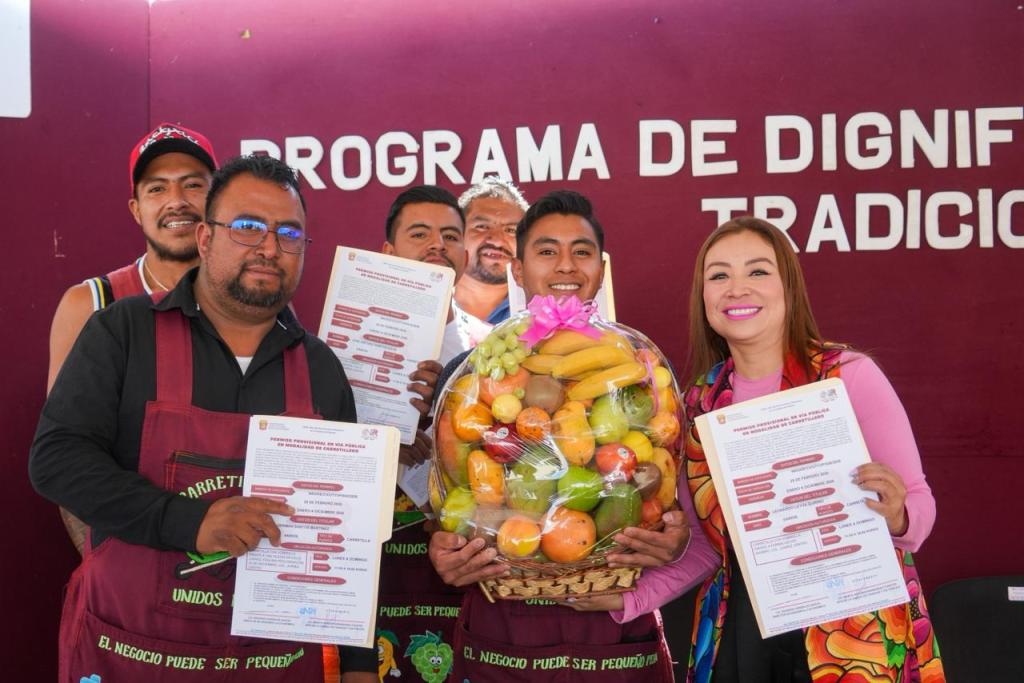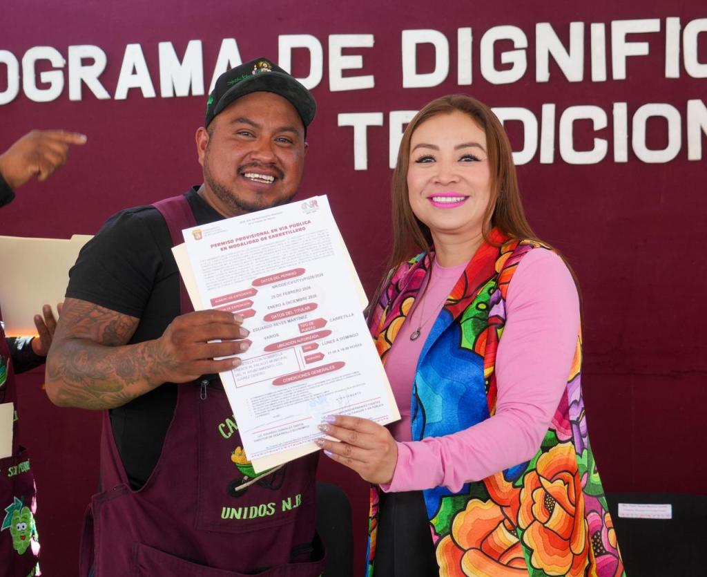 Nicolás Romero, Méx.- Al encabezar la entrega de permisos para carretilleros y boleros, a través del Programa de Dignificación de Oficios Tradicionales, la Alcaldesa, Yoselin Mendoza, aseguró que el Gobierno Municipal continuará apoyando a este sector fundamental para la economía local.