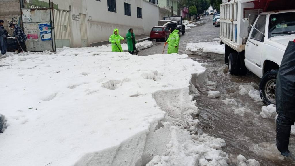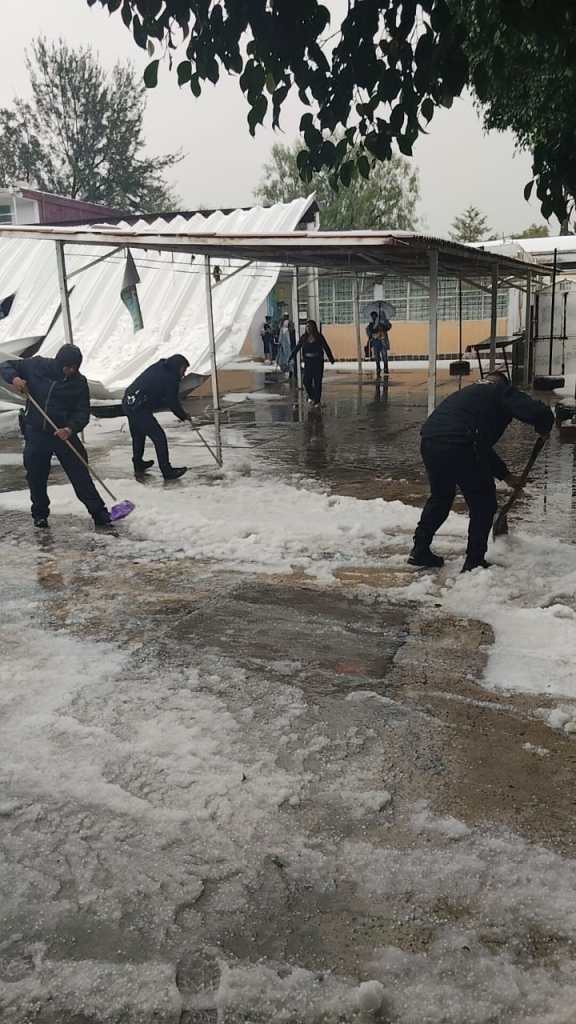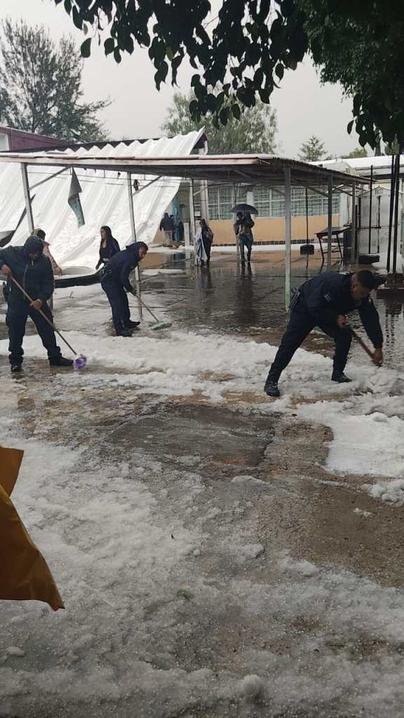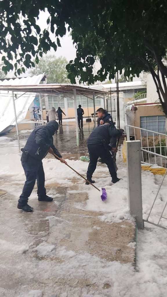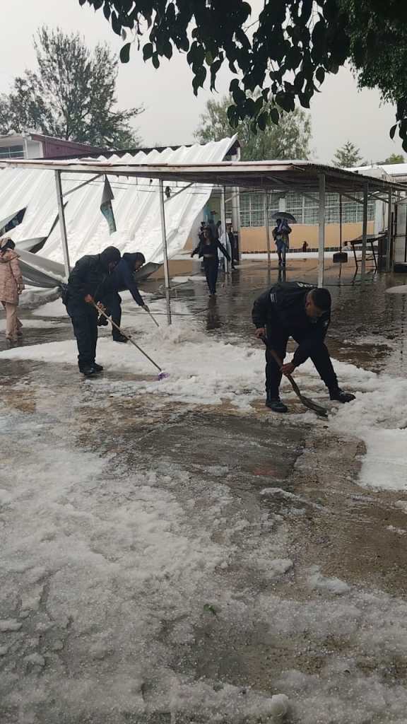 Policías municipales y personal de Protección Civil retiraron el granizo y evacuaron a alumnos y personal docente de la escuela primaria; también atendieron los desplomes del techo de un estacionamiento, de 100 metros cuadrados, de la Vocacional 3, y de la techumbre de lámina, también de 100 metros cuadrados, del Cedis ubicado en avenida Pirules, esquina con Oriente II, en San Carlos.