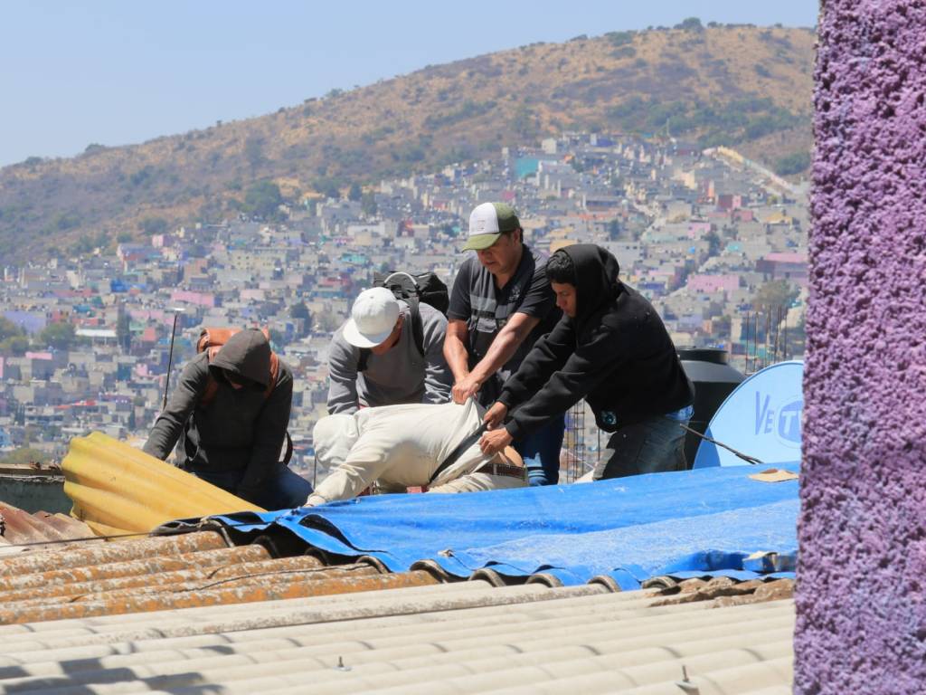 Trabajadores de la Dirección de Obras Públicas y del DIF de Ecatepec colocaron láminas en dos cuartos de la vivienda ubicada en manzana 48 de calle Villa de Allende, colonia Lomas de San Carlos, habitada por ocho personas, entre ellas tres niños, que volvieron a ocupar los espacios, pues la recámara quedó totalmente descubierta por la caída del techo y la cocina severamente afectada.