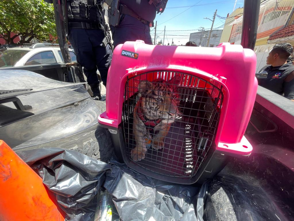 Ecatepec, Méx.- Elementos de la policía municipal y autoridades del Gobierno de Ecatepec colaboraron con la policía estatal para el rescate de un cachorro de tigre de bengala que fue hallado en el interior de una vivienda en la colonia Villas de Guadalupe Xalostoc y luego trasladado a las instalaciones de la Fiscalía General de la República con sede en este municipio.