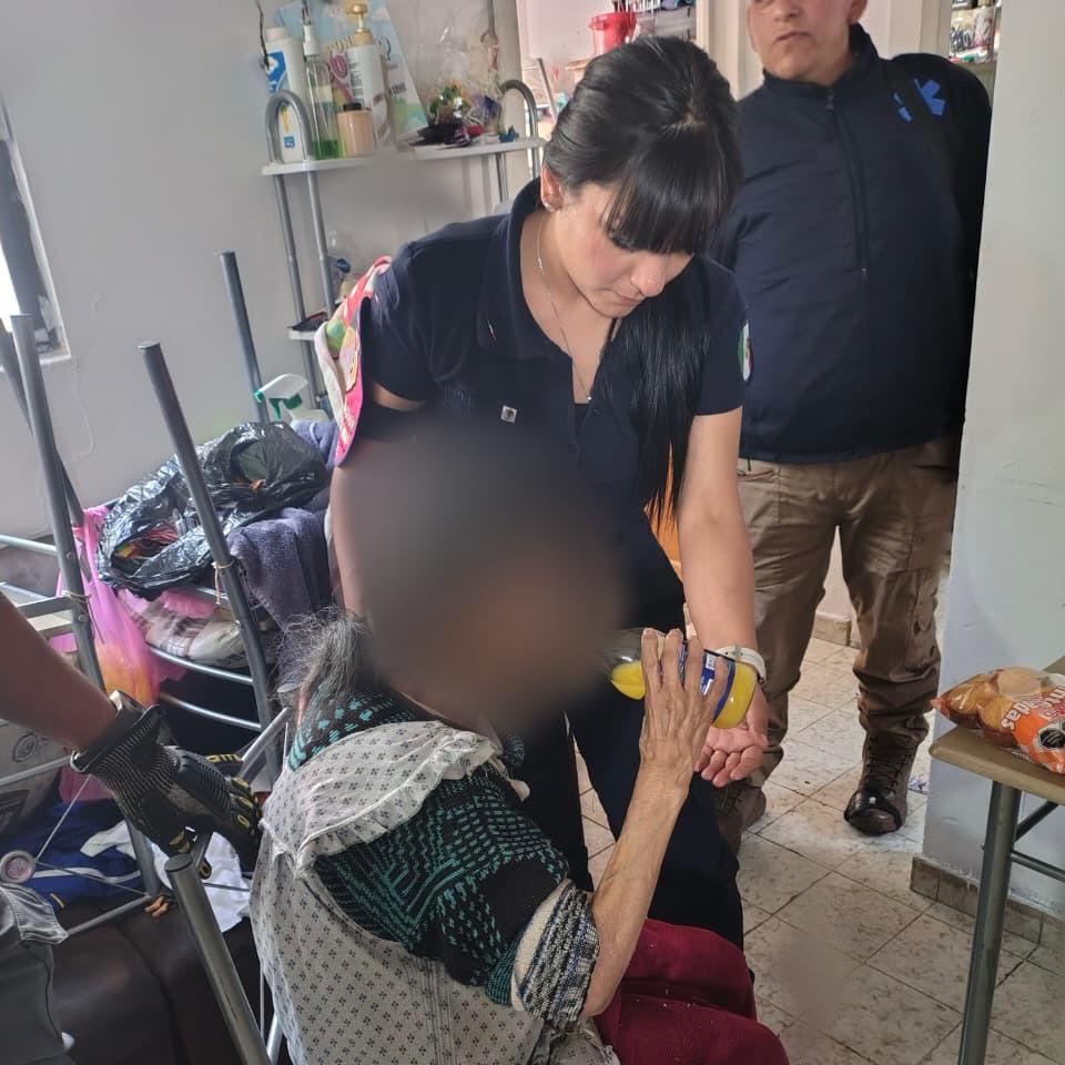 Tras una denuncia al Centro de Mando sobre una adulta mayor en situación de abandono, quien al parecer llevaba días sin comer, policías del sector 25 acudieron de inmediato, igual que personal de Protección Civil.