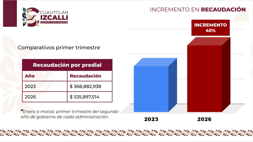 En un ejercicio comparativo entre el primer trimestre de 2026 y el mismo periodo del 2023, se registra un incremento del 45% en la recaudación del impuesto predial, al obtener 535 millones 897 mil 514 pesos, frente a los 368 millones 882 mil 938 pesos ingresados en los meses de enero, febrero y marzo del 2023.