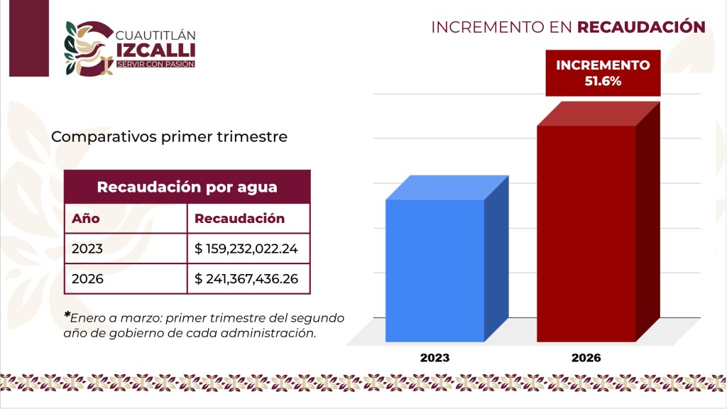 Fue superada, de igual forma, la recaudación por los derechos de agua potable, alcantarillado y saneamiento del primer trimestre del 2025, periodo en el que se ingresaron 187 millones 274 mil 774 pesos; mientras que en 2026 incrementó en más del 28%.